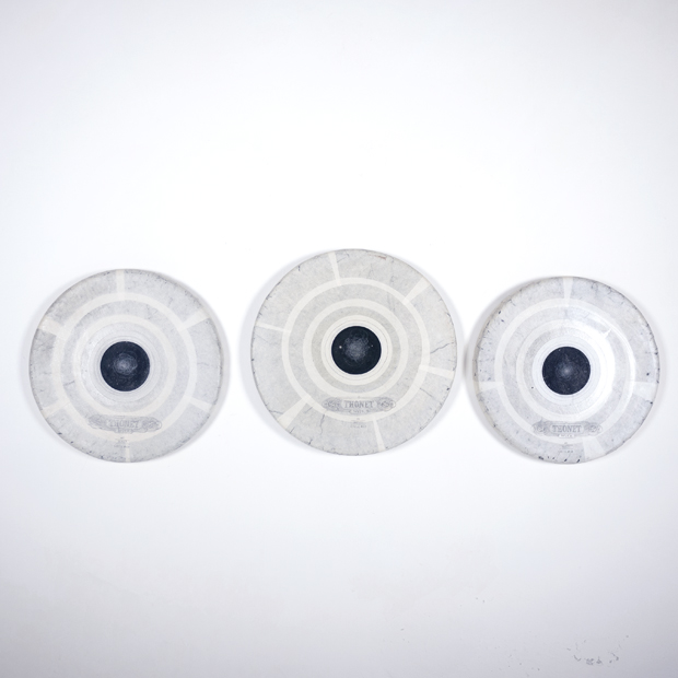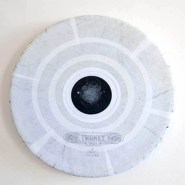 INFINITO PAN - CIRCLE THONET/ GRAPHITE ANC COLOR OIL ON PAPER ON SEAT CHAIR THONET ON PAPER AND BLUE JEANS/ DIAMETER CM. 40/ © 2017